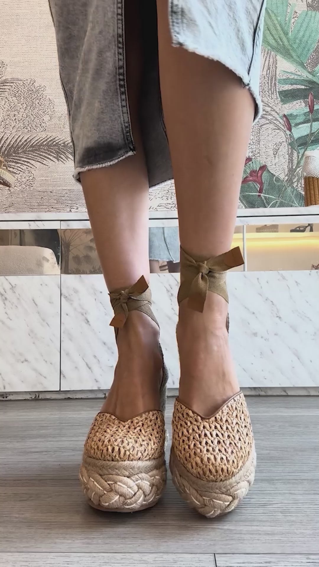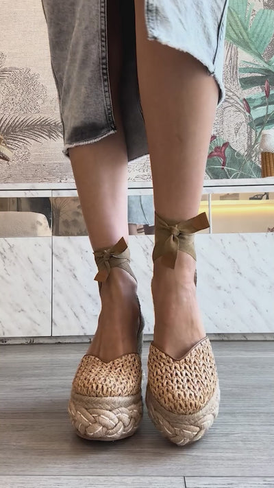 Alpargatas en rafia color tostado, con talonera artesanal y pitas que aseguran el ajuste al tobillo, plataforma revestida con fibras naturales y detalle de trenza French Couture aportan un toque único y sofisticado, ideales para tus looks de verano con personalidad.