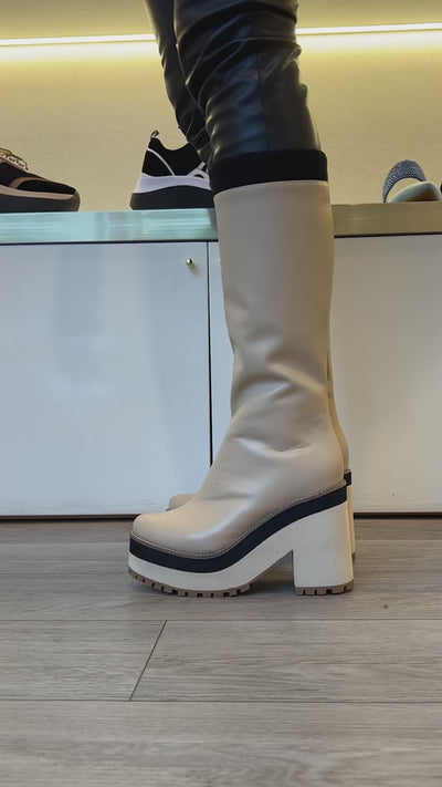Botas en cuero color crema, adornadas con un sofisticado detalle de cachemire en tono negro en la parte superior y una plataforma bicolor que aporta un toque de distinción.