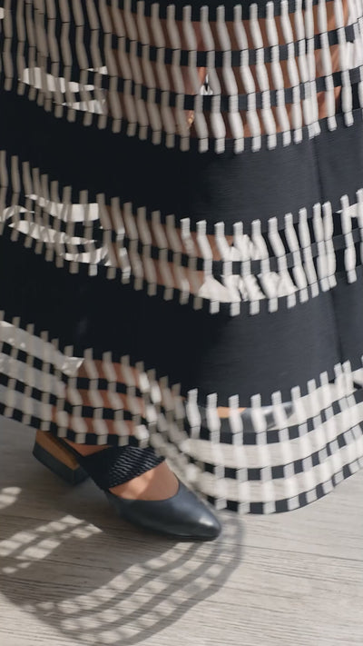 Mules flats en cuero nude, con delicados cordones en hilo de seda en el empeine y un tacón que combina texturas y colores para un acabado sofisticado.