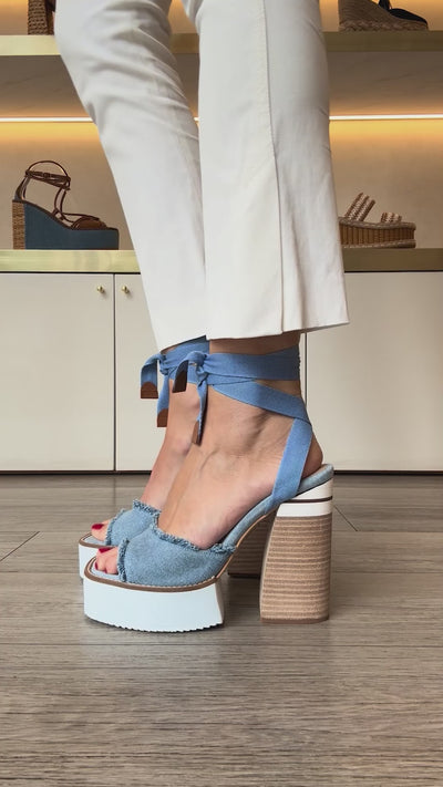 Sandalias confeccionadas en denim con el borde deshilachado en la parte del empeine, pitas para ajuste en el tobillo y un detalle en el forro del taco con acabado amaderado que aporta un toque sofisticado.