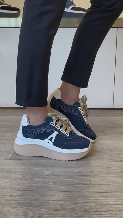 Zapatillas en denim azul oscuro y cuero blanco, detalle de costura en curva, logo Chic Chemin en cuero con planta bicolor de goma y ojales blanco.