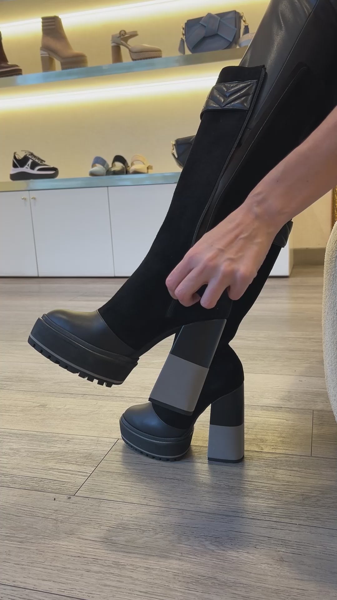 Botas de gamuza que destacan por su costura en zigzag sobre el cuero en la parte superior, combinando doble textura y color en el tacón y una elegante punta de cuero en color negro.