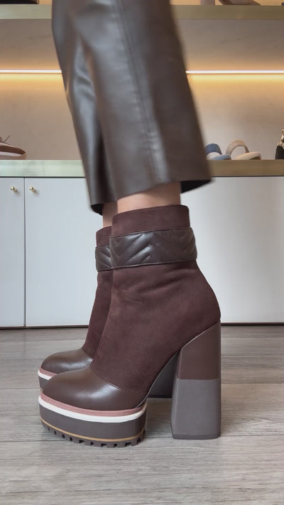 Botines de gamuza que destacan por su costura en zigzag sobre el cuero en la parte superior, combinando doble textura en el tacón y una elegante punta de cuero en tono chocolate.